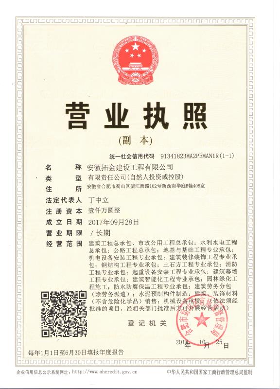 安徽拓金建設(shè)工程有限公司成立于2017年9月,正值金秋收獲季節(jié),公司目前注冊資金500萬元。