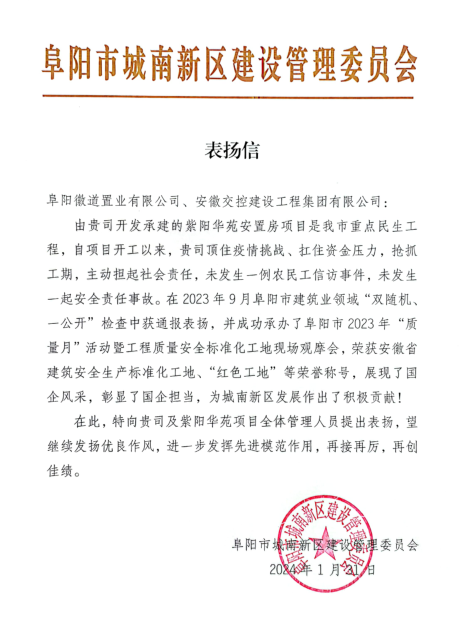 祝賀我公司阜陽紫陽華苑項目獲得當地政府的表揚和嘉獎